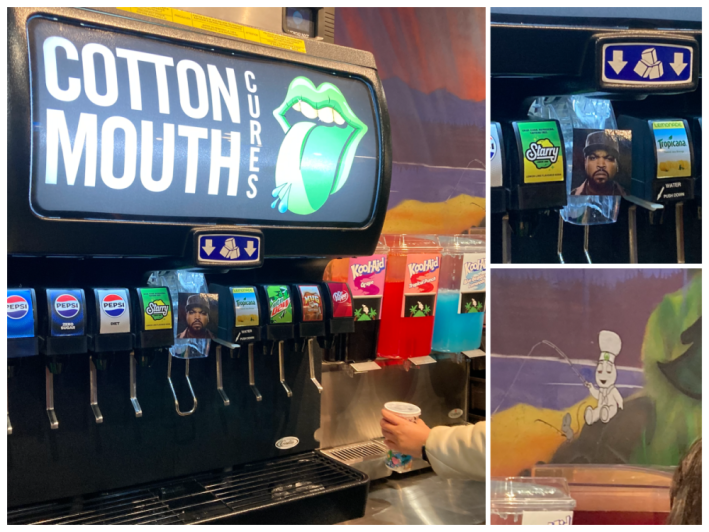 Inside the set up is reminiscent of a Subway, a cool Subway. The self-serve drink station reads “cotton mouth cures,” offering Pepsi products and a pic of Ice Cube over the ice dispenser (stoner kiddos: I actually just recommend water). There are also a variety of Kool-Aid flavors available. The walls are festooned with stoned animals and slightly altered corporate mascots: a tree with red eyes, hip-hop pigs and crows, a Pillsbury Doughboy fishing on the Mississippi.