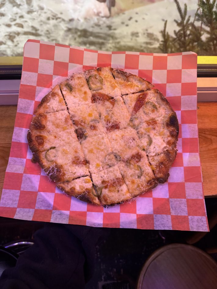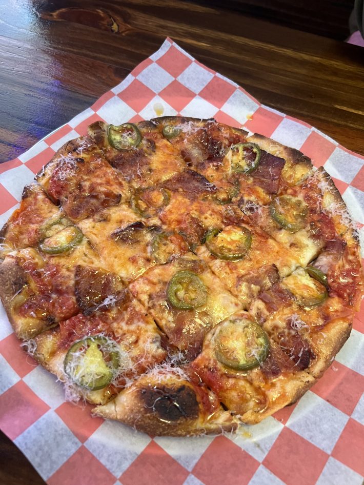 All pizzas at Good Times are good pizzas, and that includes number six. This pizza is bacon on bacon on bacon, reminiscent of the bacon boom of the early 2010s. The pro of this pie is that every bite of every slice seems to have bacon—there’s no skimping here—but the con of this pie is that every bite of every slice seems to have bacon. It’s… a lot of bacon. If you’re a true bacon believer, this is the pie for you. If not, we have other pies to order.