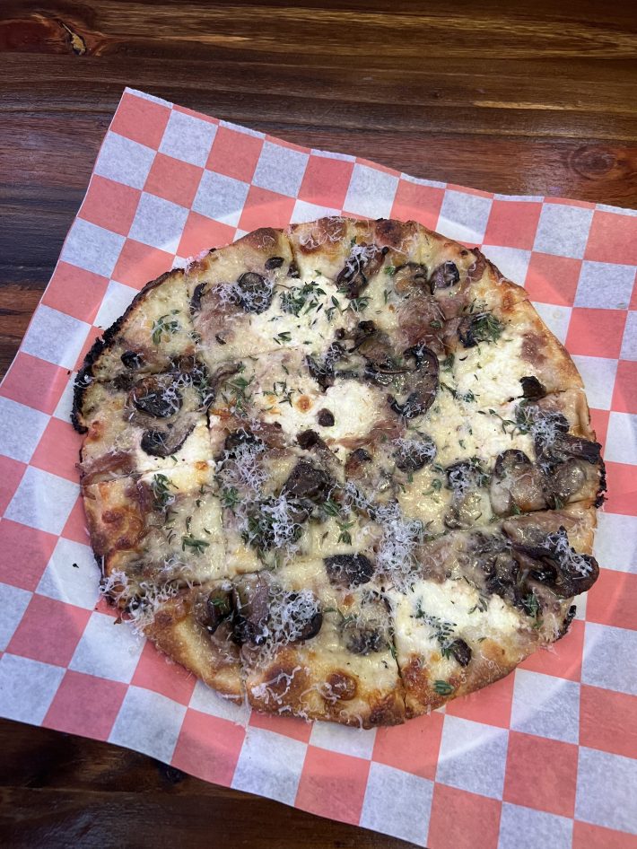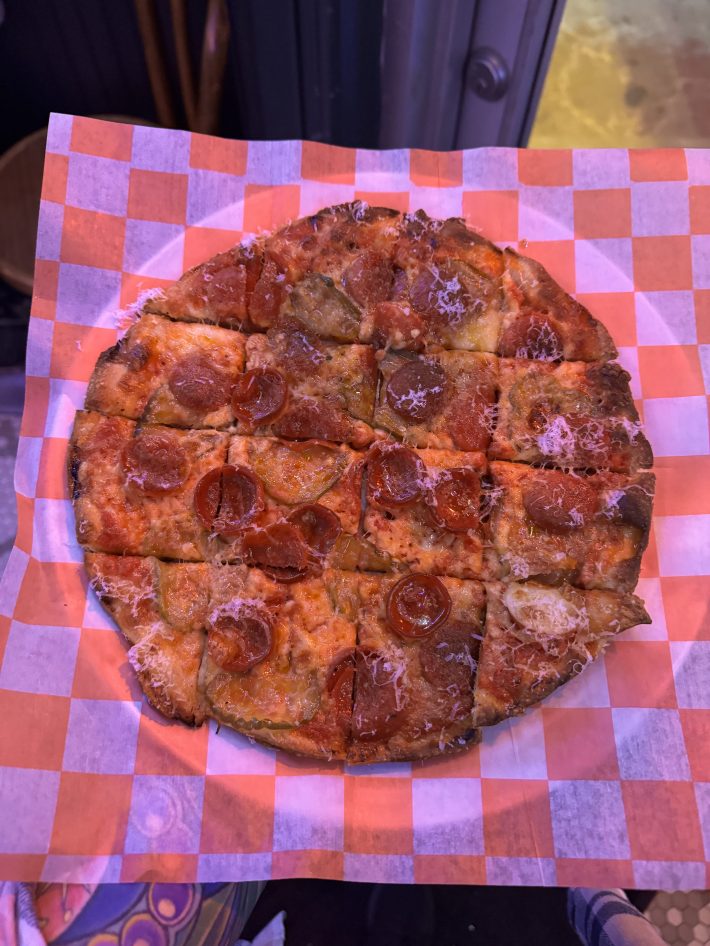 At $22, this pizza is a splurge—it’s the most expensive pie on this list. It’s also the pie I keep ordering again and again. It’s off-menu, and I affectionately call it the pickled pepper. Here’s how you order it: toasted cream base, housemade ricotta, preserved lemon, Mama Lil’s Peppers, house pickled peppers, and Mike’s Hot Honey. This is a sticky, briny, sweet mess of a pie. It’s the perfect pie to pair with a beer as you eat outside on the bleachers during the long Minnesota summer nights. After trying almost every combination imaginable at Good Times, this is my favorite off-menu creation.