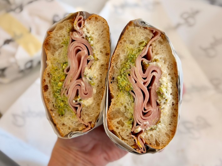 As Italian meats go, mortadella is pretty mild. It’s almost silky-smooth, and it doesn’t have the peppery punch of soppressata, the kick of capicola, or the rich and salty magic of prosciutto. In other words, you’re going to need a little something to set it off, and a cheese as mild as stracciatella ain’t it, even if the accompanying pistachios provide some much-needed crunch. Like the sandwiches beneath it on this list, PaperBoy’s Pistachio Paradise isn’t bad. But at this price point, it left us wanting more oomph, unlike those in slots one through four. (Plus, we have the truly excellent, mega-flavorful mortadella sandwich from South Lyndale Liquors ($15.95) to compare it to.)