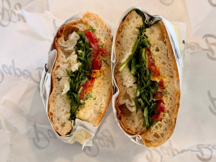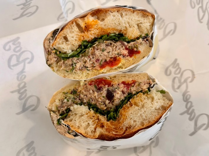Like most urban millennials who watched Chef’s Table, we’ve just recently become obsessed with chili crisp. Sandwich, eggs, pizza—don’t matter, it’s getting chili crisped. And honestly, the Tuna Conserva would be serviceable without its spoonful of zippy calabrian chilli oil. But goddamnit if that concoction doesn’t elevate the whole experience. A culinary cheat code! Elsewhere on the sandwich, you’ll find flaky tin fish of a tier that suggests the can reads “pole caught,” a delectable artichoke cream, roasted tomato, and that herbaceous leafy green that once became a quaint political scandal for President Obama. (Remember when that sorta thing dominated a news cycle? God help us.) Not to sound all HR scoldy, but you really shouldn’t smooch your officemates after housing this fish ‘wich.