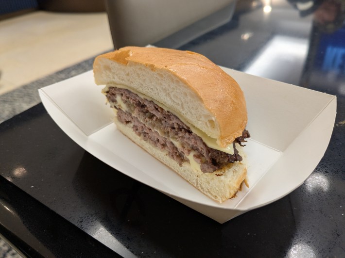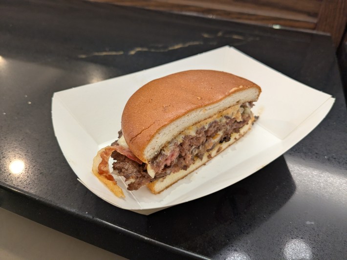 Two beef patties topped with white American cheese, grilled onions, burger butter and a horseradish cream sauce. Available at Section 233.