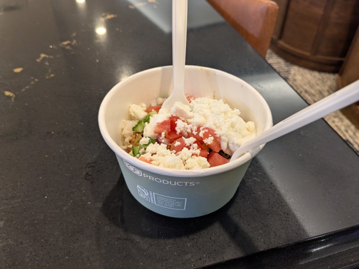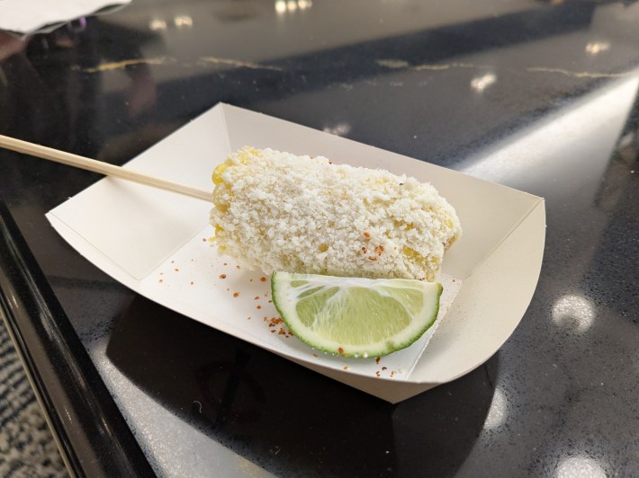 Corn slathered in condiments is a classic treat. But when you take it off the streets, it loses some of its magic. These buddies look awfully cute with their red, white, and blue coating, but the cobs were room temperature—you want them to be at least a little warm. The cheese-and-mayo mixture (we opted for the cotija-encrusted flavor) was oddly sweet, with a sugar-forward flavor dominating everything. And after squeezing our lime wedge over everything, it left an odd aftertaste reminiscent of Fruit Loops.