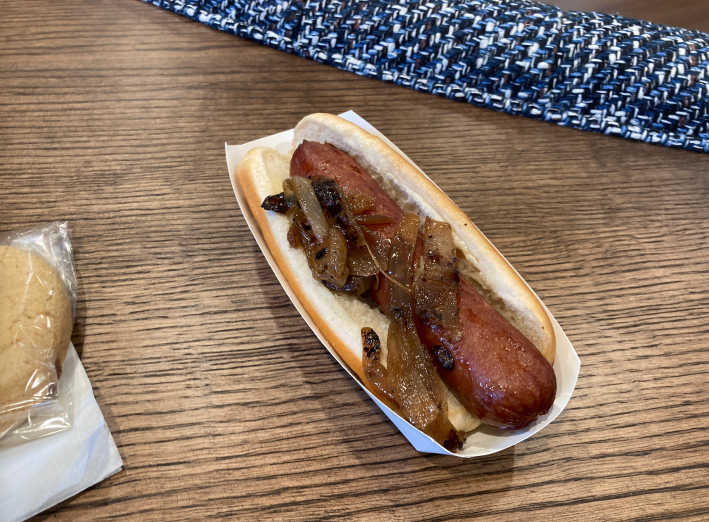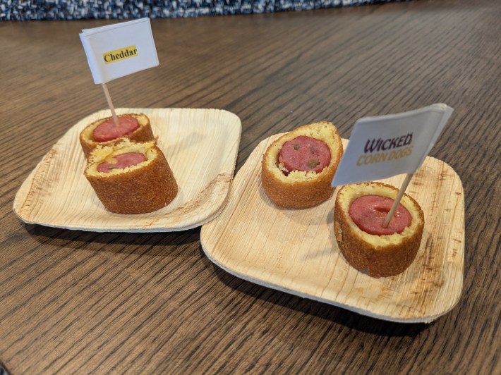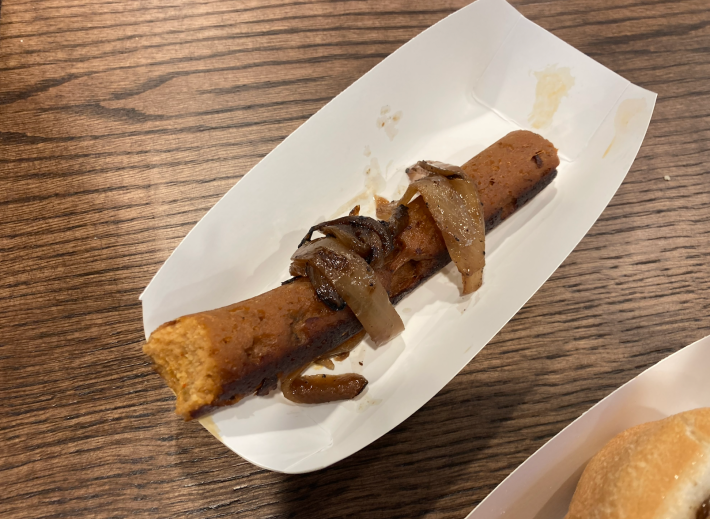 When we approached the buffet section offering labeled as two trays of vegan meats from Herbivorous Butcher we were dubious, as one looked way different than the other. But vegan sausage has come a long way over the past few years, and some even look just like the real thing, so we shrugged it off and scooped up a dog. On first bite I, Jessica, someone who has been on the vegetarian spectrum for 35-40ish years, knew something was off. This was no meatless dog. I tried to confirm WTF I just ate, but there were no reps for this portion of the buffet. Eventually, towards the end of the event, a new sign appeared, confirming that it was indeed a kosher beef hot dog.