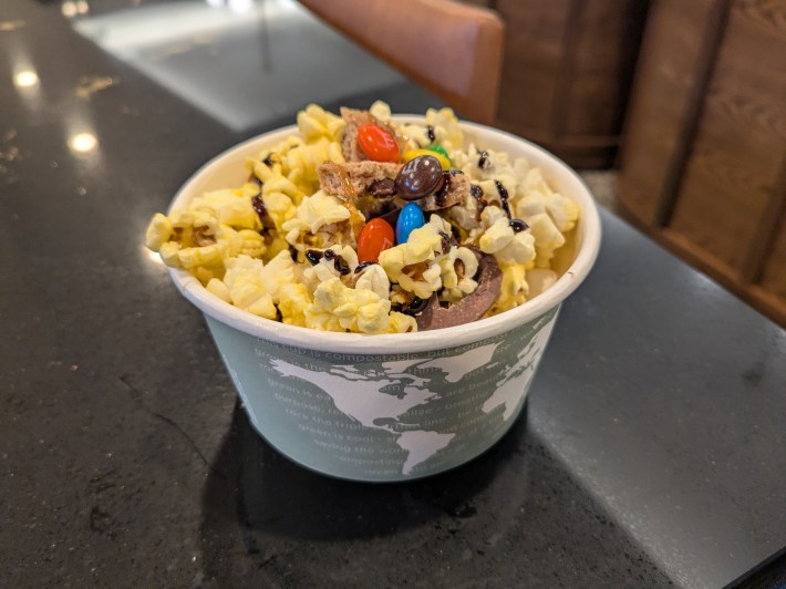 Fresh-popped popcorn topped with a customizable selection including Reese’s Pieces; M&M’s; crushed Oreos; chocolate-covered pretzels; yogurt-covered pretzels; Nerds clusters; cookie crumble; miniature marshmallows; and chocolate, white chocolate, or caramel sauce. Available at Section 106.
