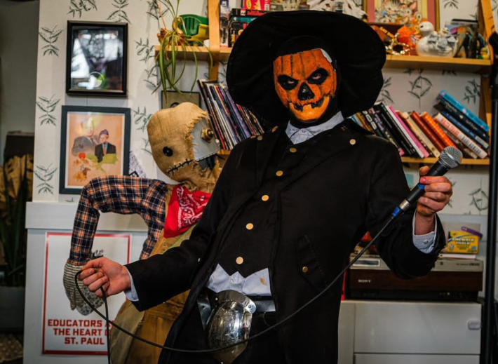 - Count Spookula with King Sized Coffin, BIG DELICIOUS, and Unattractive Giant Monster @ 7th St Entry—There I was, biking to Duck Duck Coffee on a glorious Sunday autumn afternoon, and what should I behold but a sidewalk crammed with becostumed kids, their amused parents, and other gawkers, many of their foreheads anointed with bloooood from an unholy chalice. In the bed of a pickup, Count Spookula, a wiry black-clad man with a jack-o’-lantern face, regaled us with pre-recorded tunes about bats, monsters, and falling in love with spiders. It was the least spooky context imaginable, yet it was perfect. Tonight’s “ritual,” as the Count refers to his shows, won’t have toddlers dressed as Spider-Man or Matilda bouncing around, but you’ll have a good time regardless. Boo! Or mwahahahaha, as the case may be.