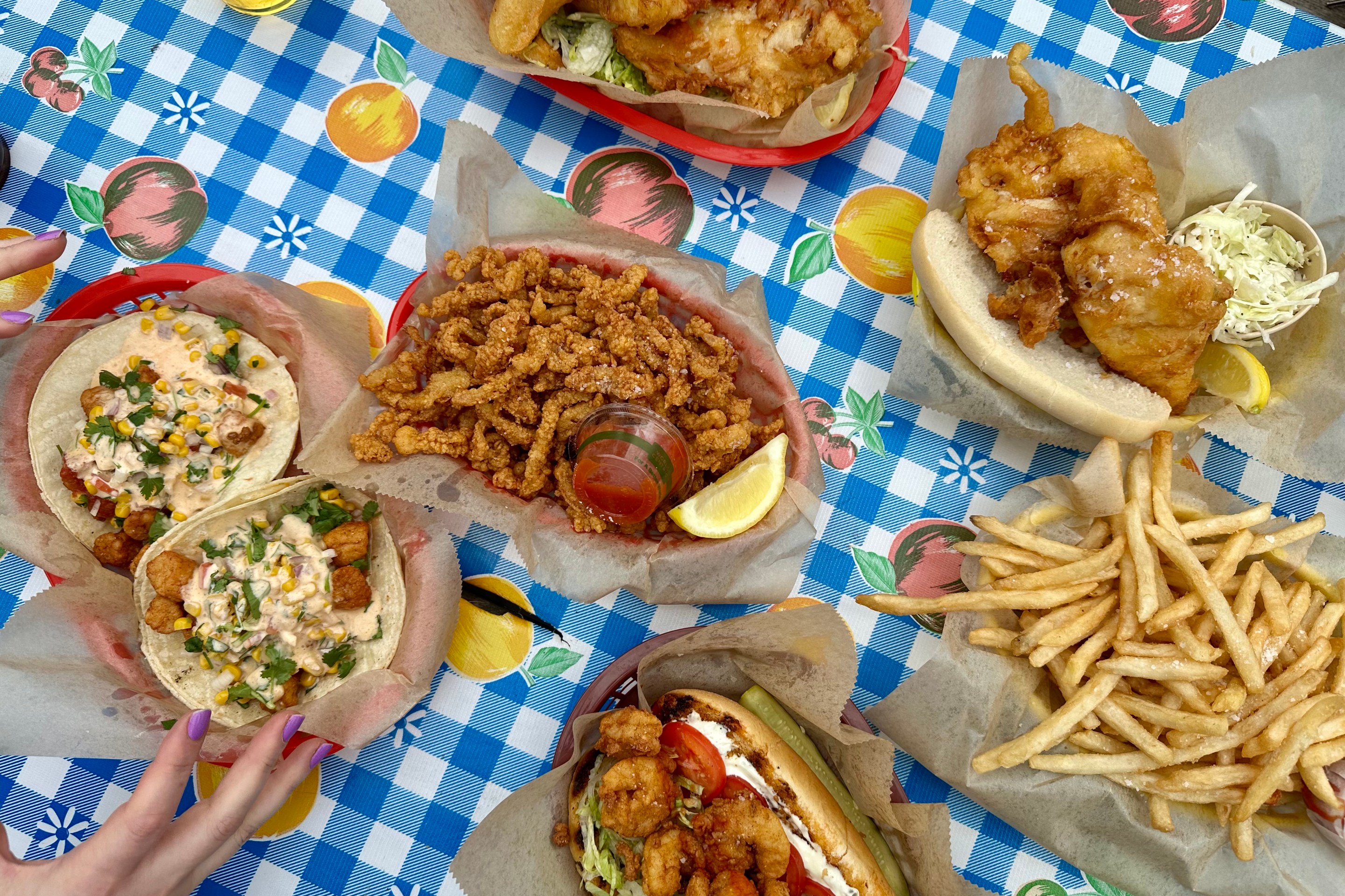 The bar at Le Burger features prominently; it’s where you place your order and it takes up a good chunk of the room. But the drink list is pretty trim, and nearly everything is on tap, from a “hoppy beer” and “lager beer” available for six bucks each to the wine to the cocktails. The NA options are solid: There’s a root beer float, Shirley Temple, Arnie Palmer, and pomegranate lemonade, along with zero-proof wine from Dry Wit and a Phony Negroni. We were sipping a lager beer and Dry Wit’s Salinger when the food arrived, all wrapped in adorable Le Burger-branded paper.