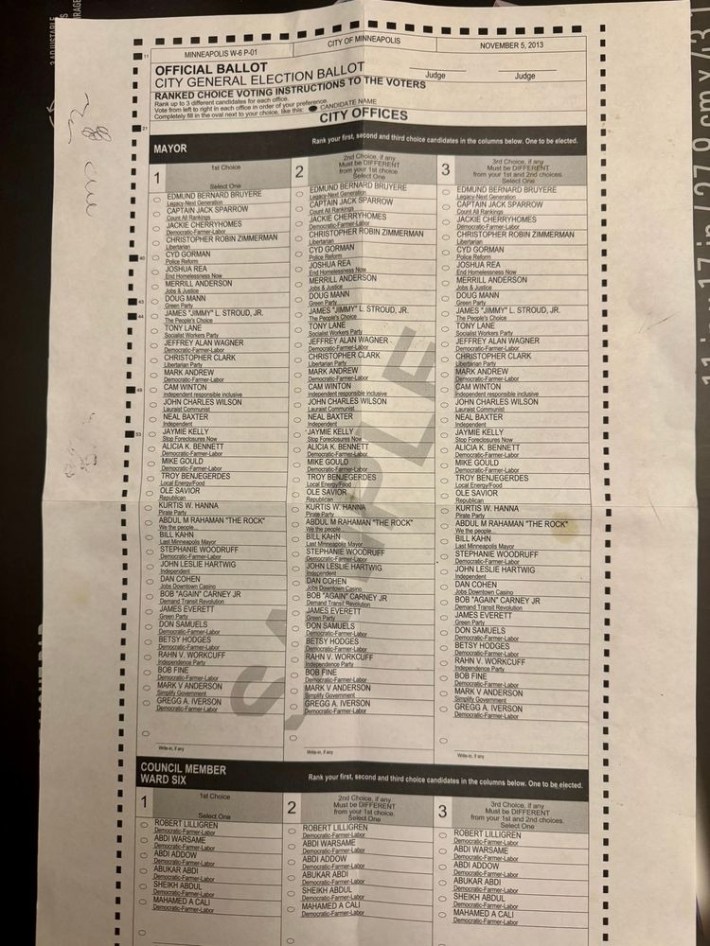 In 2006, Minneapolis voters approved the adoption of ranked-choice voting (aka instant-runoff voting). The ballot process—which advocates say gives voters more choice, while detractors say it baffles them—debuted in 2009, though it didn't really matter in the mayoral contest; incumbent R.T. Rybak ran away with 73.6% of first-choice votes that year. Thus, the avalanche of '13 candidates put Minneapolis's newish voting system to its first real test.
