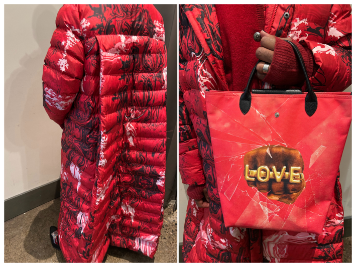This [coat] is by designer Pyer Moss in New York and I believe it was a collaboration with Nike. I like it because it’s very warm and very long. It came in black, which I have, and it came in white, which I also have, and it came in a short bomber jacket in red and white, which I have. So, I have all four of the jackets.