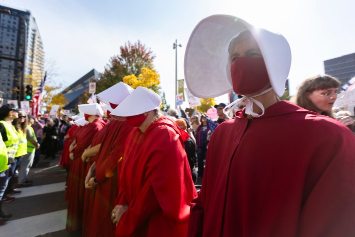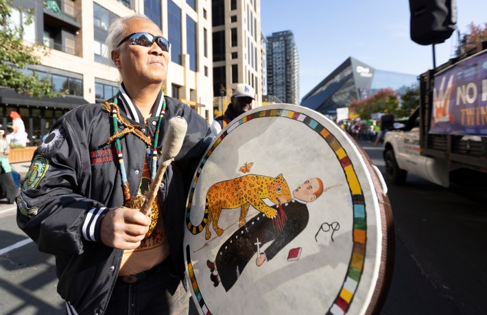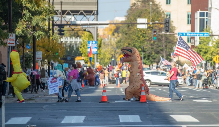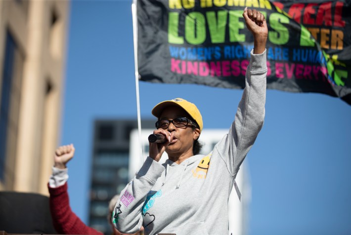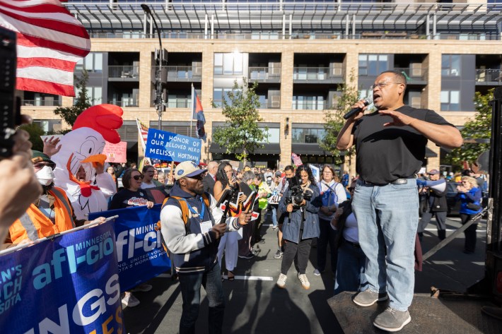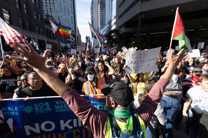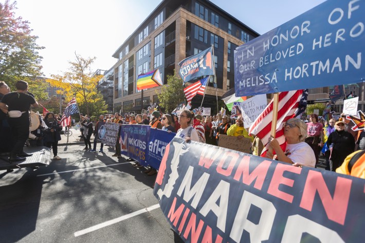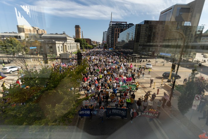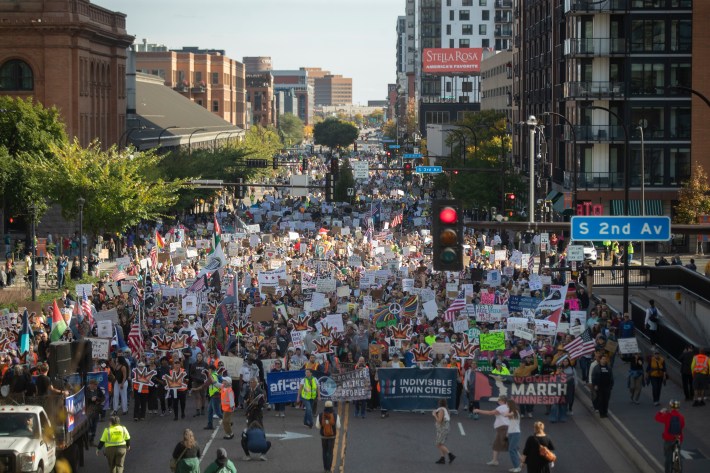 The downtown march went on a 1.3-mile loop beginning at The Commons park, hading up Washington Avenue, going west on Nicollet Mall, and then moving south on South Fourth Street, back to The Commons. "When the front of the march got to the finish there were still three blocks of protesters lined up that hadn’t even started marching," says our photographer, Chris Juhn. "There were so many people."