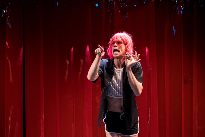Engh’s script is hilarious, breakneck, and so profusely gay that it reads like a dialect. It exemplifies how much the amorphousness of gay identity owes to a ravenous consumption and regurgitation of media. Ramert’s brashly rendered performance as Ciprian especially packs in the references, cribbing constant quips and mannerisms from the baffling churn of gay internetspeak. “That’s your husband”; “That’s not the truth, Ellen”; “I went to Epstein Island and everyone knew you”; “#MeToo never made it to the gays”; skinny, skinny, skinny.