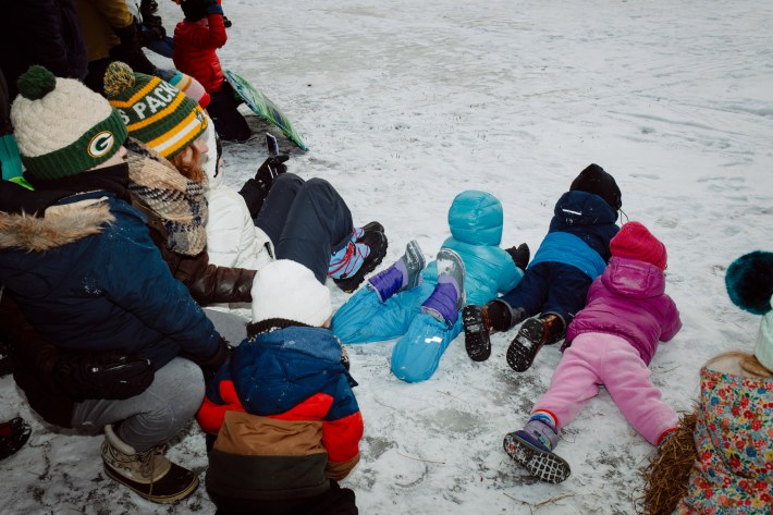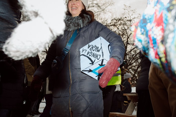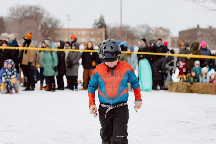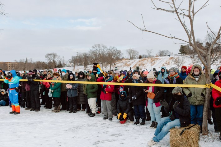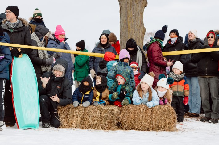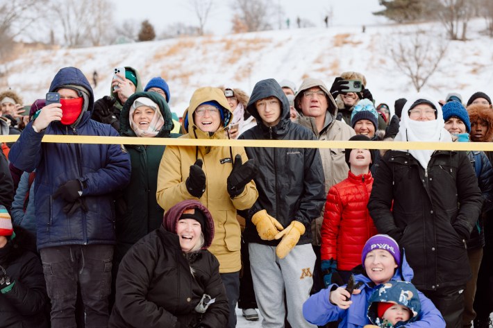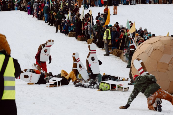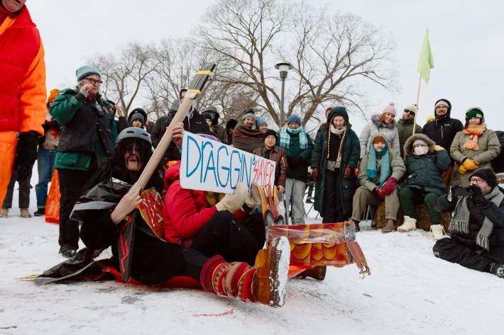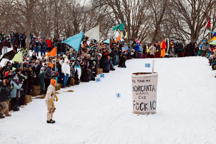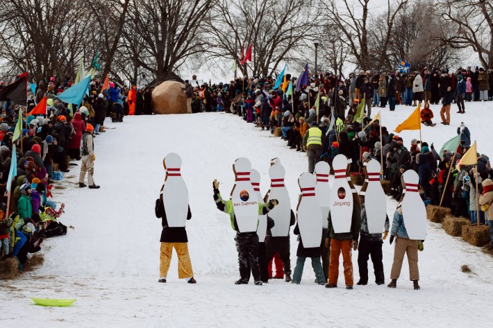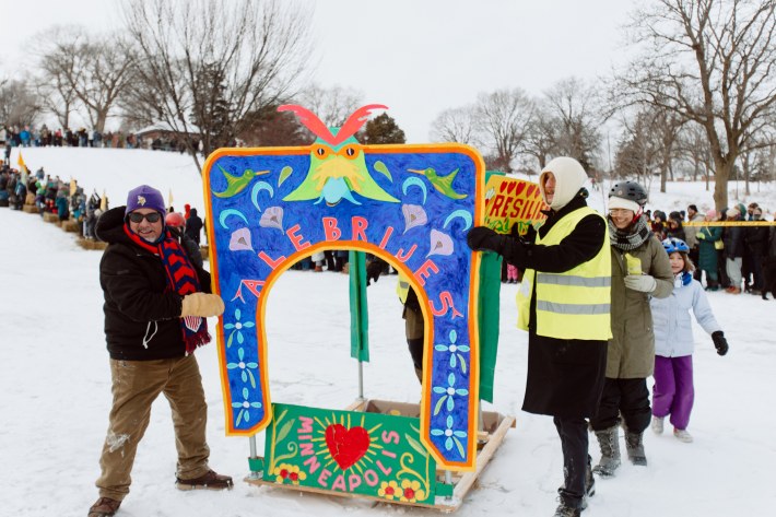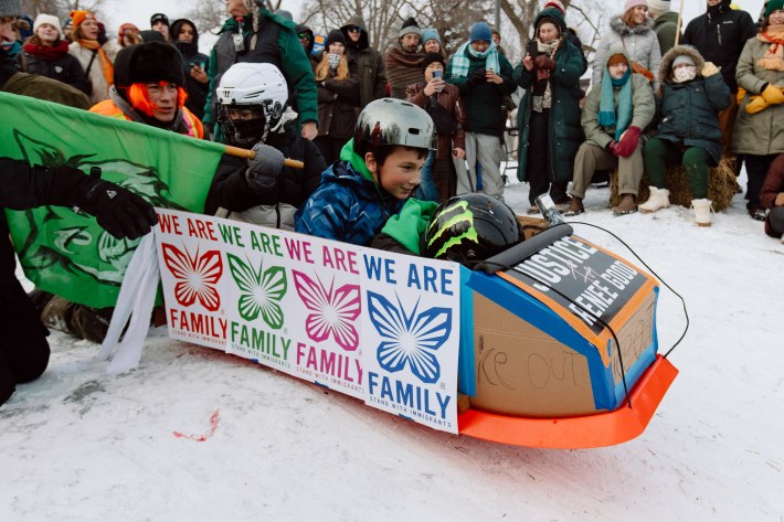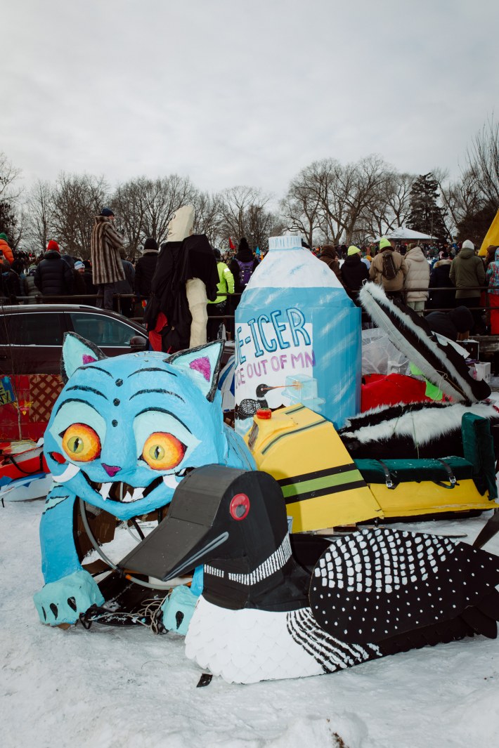 And this year, the Art Sled Rally took place amid ICE's ongoing invasion of the Twin Cities. Below, you'll see a giant cardboard bowling ball crashing into pins painted with names like "Trump" and "Orbán." You'll see a laser loon-emblazoned jug of de-icer. You'll see giant cups of horchata—"warm, cuz fuck ICE"—and kids commandeering sleds with messages like "justice for Renee Good."