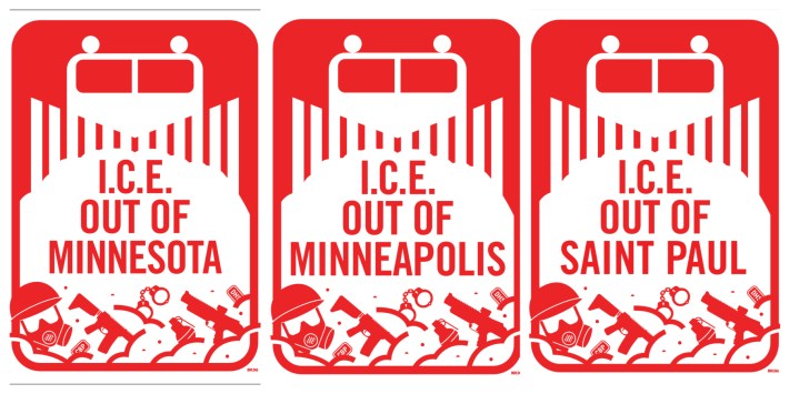 That’s what the gang at Burlesque of North America are doing with their “I.C.E. Out of Minneapolis” poster, a playful spin on our ubiquitous red-and-white snow emergency/snow plow route signs. Co-owners Wes Winship and Mike Davis worked on the design off and on for a few weeks, eventually printing them off in time to start giving them out at last month’s anti-ICE protest in Minneapolis’s Powderhorn Park.
