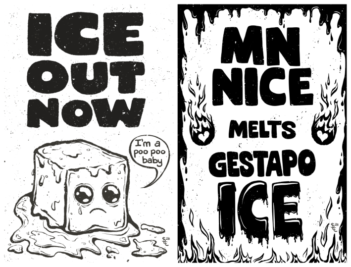 Her anti-ICE posters, which are free to download, proclaim “MN Nice Melts Fascist ICE,” “ICE Out Now,” and, our personal favorite, the succinct “Fuck ICE.” Two of her printouts include an adorable little ice cube with the doe-est doe eyes you’ll ever see. It looks sad as it melts away. That’s right, suffer little buddy.