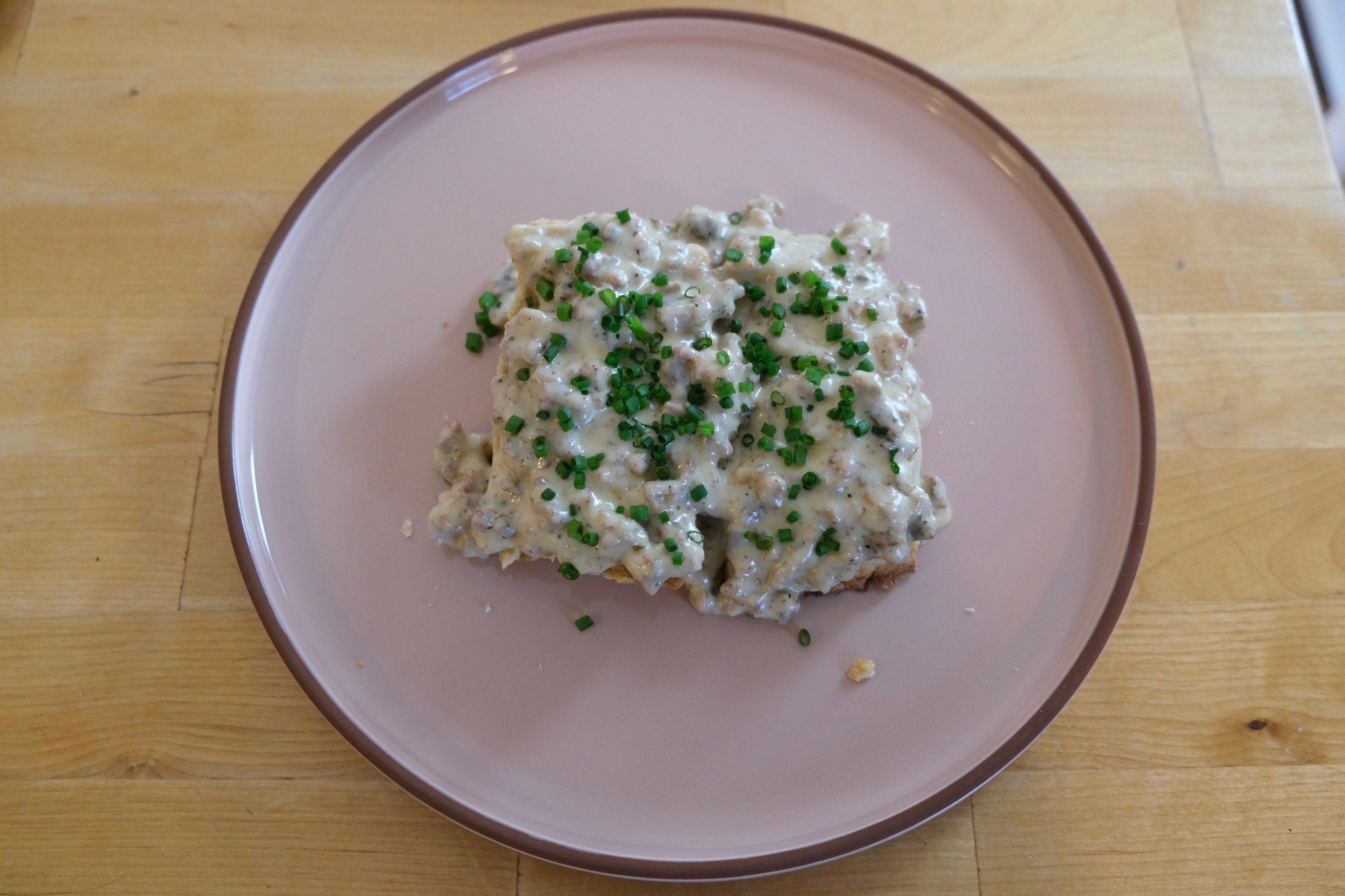 Anytime I make a nice B&G at home, I always follow J. Kenji Lopez-Alt’s cream biscuit method. It’s way easier and faster than a traditional buttermilk biscuit and tastes just as good, in my opinion. They’re a little less flaky, but seeing as we’re slobbing a bunch of gravy on top of them, flakiness doesn’t matter much here.