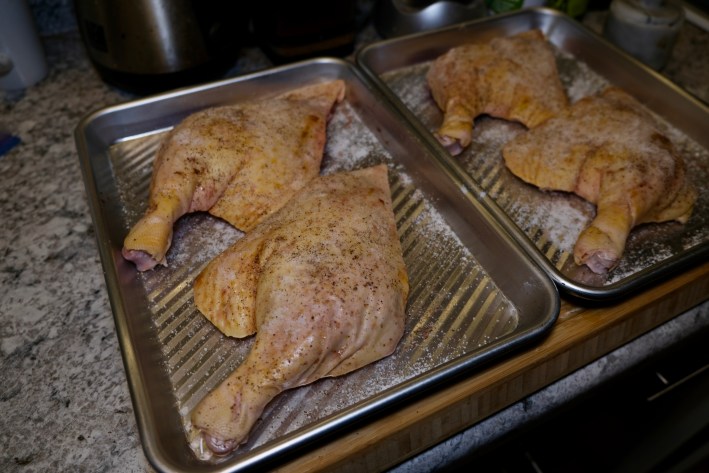 - Prepare the duck legs and decarb your weed. Preheat your oven to 240 degrees. Lay your duck leg quarters out on a quarter sheet pan. Using a paring knife, gently poke or score each duck legs’ skin. Piercing the skin and underlying fat layer helps the fat render more consistently. Liberally season the legs on both sides with salt, pepper, and any other spices you’re using. I kept mine pretty simple and opted for just salt and black pepper. Place the legs in a ziptop bag and chill in the fridge overnight.