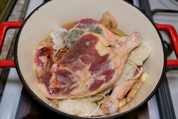 - Conqui’d the duck. Preheat the oven to 240 degrees again. Pull your duck legs out of their fridge prison and walk them right into a Dutch oven skin side down. Don’t worry about trying to fit them all in a single layer as they’ll soon be mostly submerged in delicious duck fat anyways. Wrap your decarbed weed in cheesecloth and tie each end with butcher’s twine. Do the same with the other herbs. You can forgo this step and instead just throw all the herbs (and herb) directly into the pot with the duck but putting them into sachets keeps the fat cleaner with less material to strain out at the end. Nestle both herb sachets under the duck legs to ensure they’ll be fully submerged in the duck fat we’re about to rain down on everything. Cut a full bulb of garlic in half and add it to the pot, skins and all. Cut an unpeeled knob of ginger in half the long way and give the inside a couple good whacks with a knife to score it before adding it to the pot.