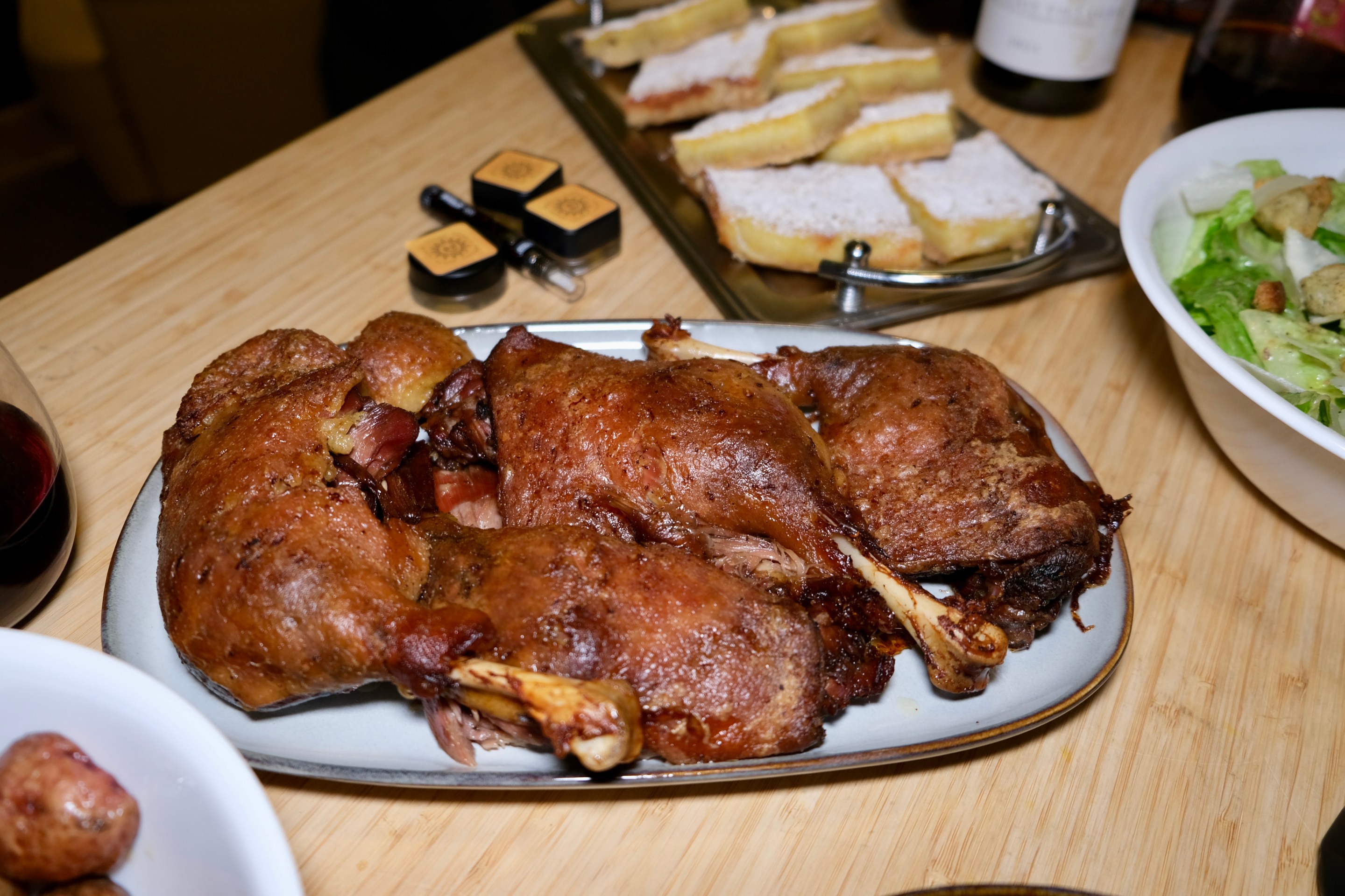 - Feast! While the duck confit and duck fat potatoes are a full feast in themselves, I served them alongside an equally infused appetizer, salad, and dessert. For the appetizer, I went with a duckified version of Deviled’s Lettuce Eggs. I followed the recipe exactly except anywhere it called for a regular chicken egg, I used a duck egg. I also used infused duck fat in place of oil for the mayo. If you’ve never made duckonnaise, I can’t recommend it enough. My friend Jim, a noted deviled egg enthusiast, declared them to be the best deviled eggs he’s ever had, which was high praise from a very high man. For our salad, I went with a duck fat Waedsar and it was equally as tasty—and potent! While I have no real idea just how infused this duck fat really is, all evidence from this feast and all the things I’ve made with it since point to it being very fucking potent. For dessert, I made orange bars with a duck fat shortbread crust. They absolutely ripped and Jim said he’d easily pay $16 for one in a nice restaurant but has yet to send me a Venmo. We’ll cover that recipe in next month’s Weedeater! I also paired the whole affair with a fruity and precocious Beaujolais!