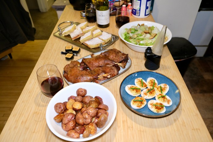 As I mentioned earlier, I ended up with about three cups of infused duck fat from this recipe. Now, obviously I used some for the potatoes, deviled eggs, salad, and orange bars but even after all of that, I still had a little more than a cup leftover. In the days since this feast, I’ve made everything from duck fat queso to duck confit mac and cheese with some leftover duck meat. I even made duck fat scrambled eggs and they kicked a ton of ass. Duck fat popcorn, duck fat fries, duck fat cookies—the possibilities are truly endless. I’ve basically just started replacing oil and fat in other recipes with infused duck fat and my life seems to be better because of it.