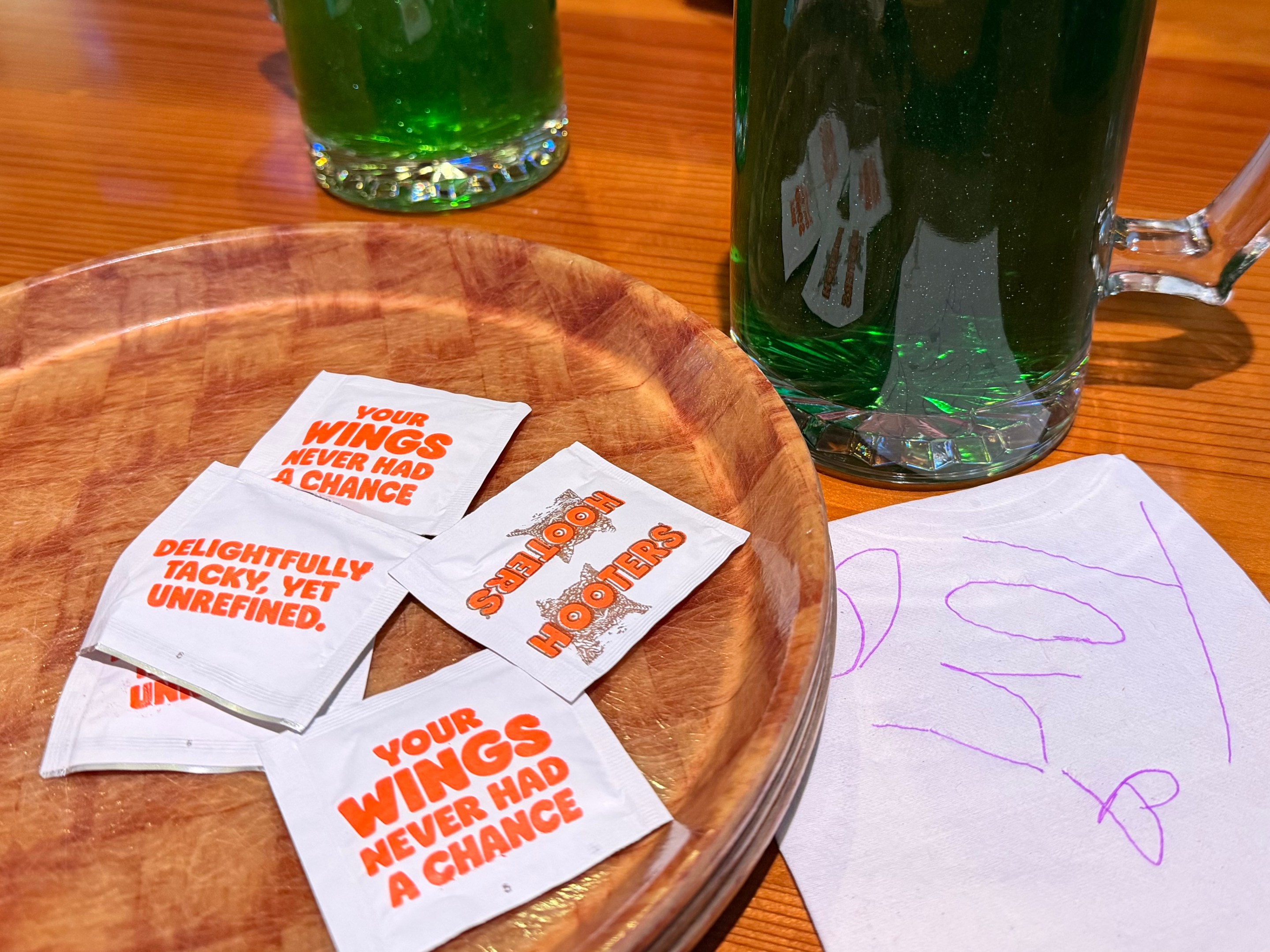 Ian: Yes. We both remarked how the “Delightfully Tacky, Yet Unrefined” slogan on the back of the uniforms truly captures its essence. The brand and reputation of Hooters overstates the sexualization to such a degree that I think the actual experience of it feels almost wholesome??? The first table I saw as we walked in was a group of middle-aged Latina women celebrating a birthday. One of them had to stand up on a chair while the waitresses sang. You’re going to a sports bar where the servers are dressed slightly more provocatively than average, but the vibe is more campy than risqué. It’s drag brunch for divorced dads.