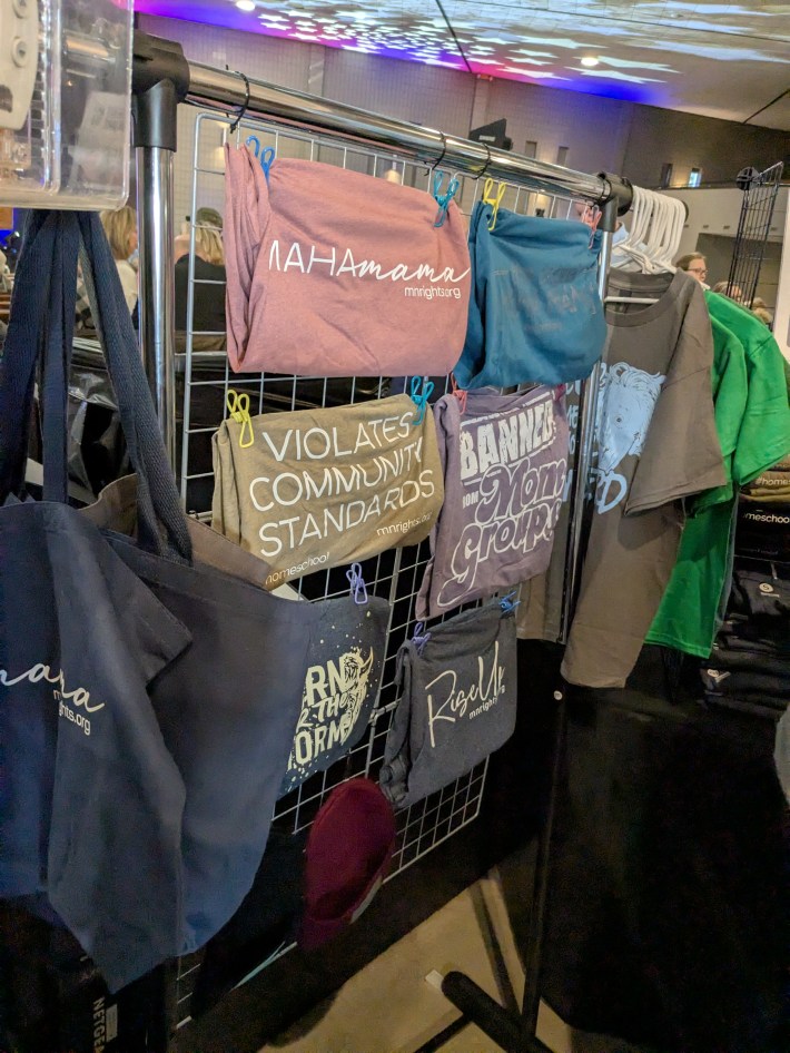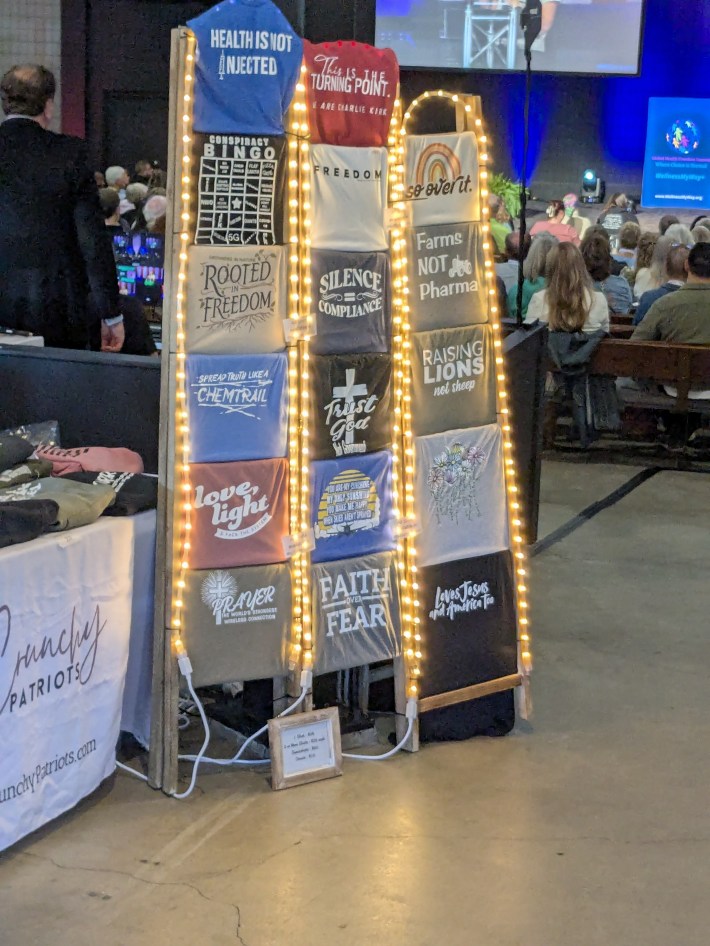 Spectratherapy and probiotics were on offer, and the John Galt Mortgage Company offered an alternative to all those socialist banks. You could get your non-medical vaccine exemption form notarized. (Minnesota allows parents not to vaccinate their child “based on their beliefs.”) A table run by the company Crunchy Patriots sold T-shirts with messages like “Health Is Not Injected,” “Farms Not Pharma,” and “Spread Truth Like a Chemtrail,” along with a few celebrating the legacy of Charlie Kirk.
