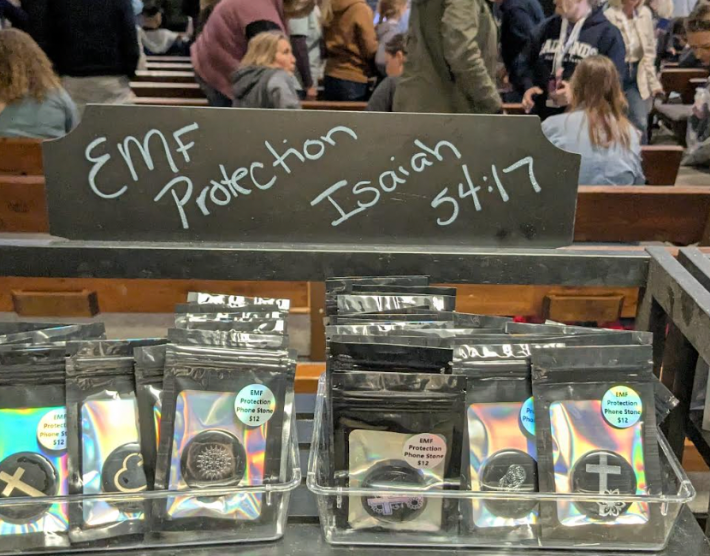 Both on the grounds and inside the church, vendors worked booths catering to a fear of contamination. Some sold 5G shields, others peddled organic oils and honey at a stand identical to what you might find at your local farmers market except for the “Walz Lies” sign. A product that allegedly protects you from electromagnetic frequencies was verified with a reference to a verse from Isaiah.