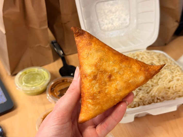 At $23 before tax and tip, 7 Spices bill would have been the best deal of the day even if the food wasn’t our favorite (which it was). We ordered nine sambusas—three beef, three salmon, and three veggie, all two bucks a pop—and a heaping platter of cumin-y rice ($5) and loved every bite. The palm-sized, perfectly golden-brown shells gave way to crumbles of flavorful beef and onion or soft lentils and spinach, and the accompanying house-made hot sauce, a minty green color that belied its serious heat, kicked those flavors into another dimension. The assertive seasonings sold us; we’ll be back for 7 Spices’ lamb and goat platters.