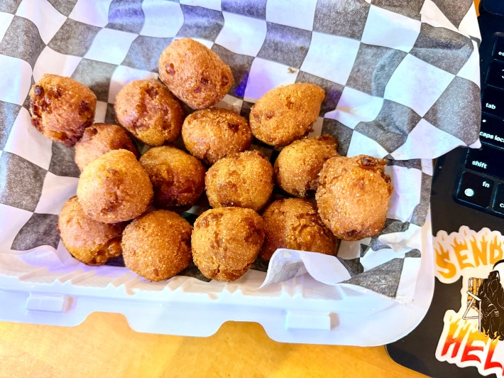 Nolen’s mixes proprietary seasoning blends and rubs for its wings, tenders, burgers, and brisket. And it’s not all meat: Baked mac ‘n’ cheese, jalapeño poppers, and even some vegan options like a burger and cauliflower bites are all on the menu. So far, I’ve had only the hush puppies ($6 for 15 of ‘em!), served piping-hot, drizzled in honey, and deep-fried to crispy perfection. The only thing missing was a side of whipped butter for added Southern decadence.