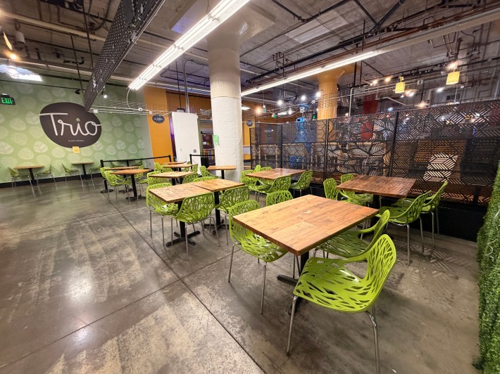 Racket’s vegetarian staffer is a fan of Trio’s wraps. This meat-eating Racket staffer sticks to their apps, particularly the cauliflower wings ($15), available tossed in buffalo, Trio BBQ, BBQ Sriracha, or lemon pepper seasoning. I’d skip the $15 Burger Mac on a return visit (just too many competing flavors and textures, between the BBQ sauce, diced pickles and tomatoes, ground Beyond burger, and crushed potato-chip topping) and go for one of the For Your Soul Bowls instead, which got rave reviews at Trio’s original location.